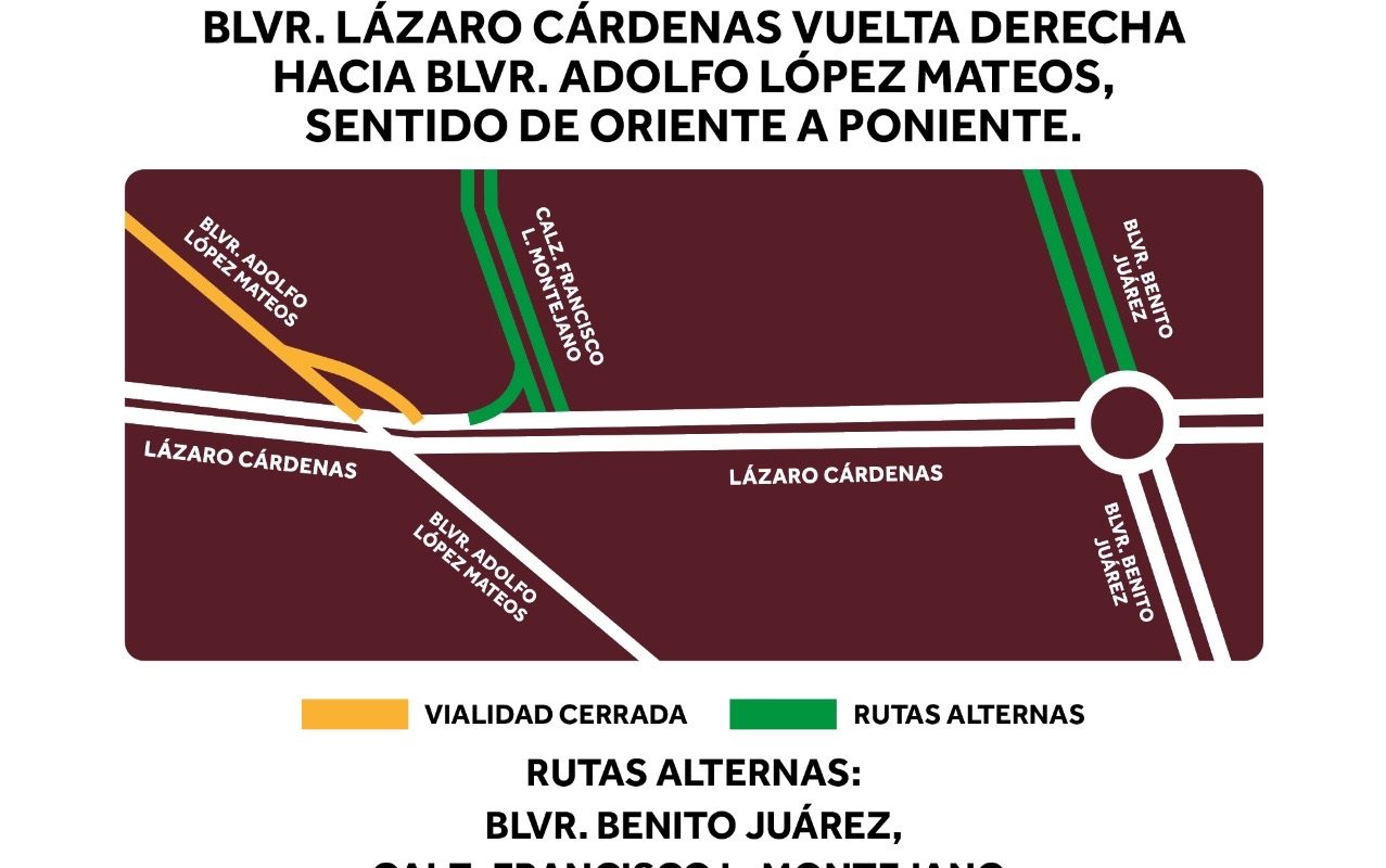 Por tal motivo, se cerrará la circulación en el sentido oriente-poniente, específicamente en la vuelta a la derecha de Lázaro Cárdenas hacia Adolfo López Mateos. Ante ello, se le recomienda a la ciudadanía utilizar rutas alternas y circular con precaución en dicha área ¡Disculpen las mejoras!