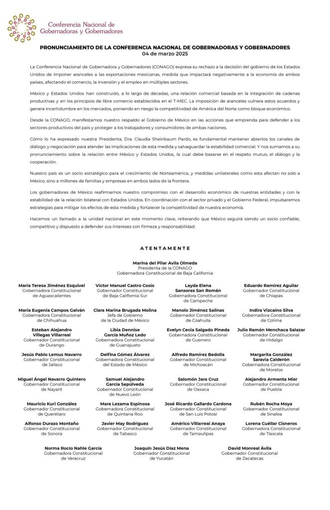 La gobernadora Marina del Pilar expresó su solidaridad con la presidenta Claudia Sheinbaum, ante la imposición de aranceles por parte del gobierno de Estados Unidos.