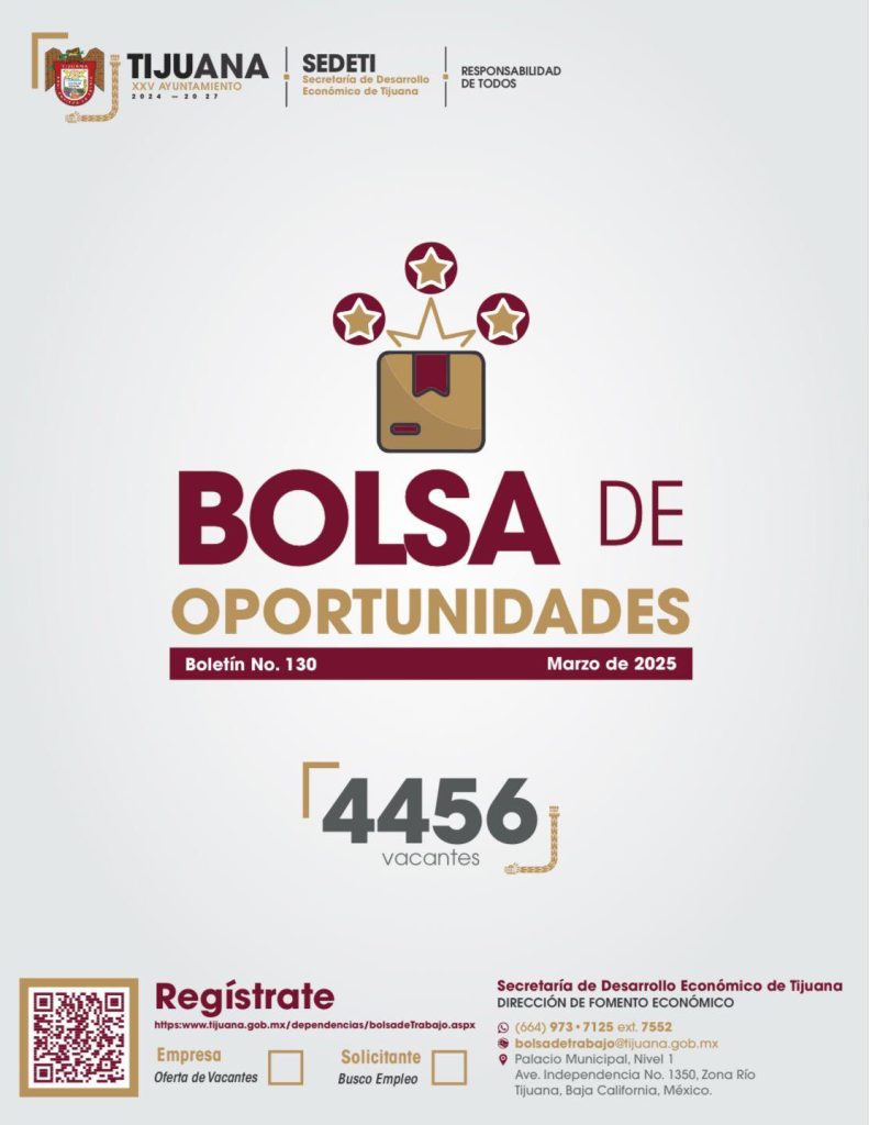 Con el objetivo de facilitar el acceso a mejores oportunidades de empleo para las y los ciudadanos, el XXV Ayuntamiento de Tijuana, pone a su disposición una amplia bolsa de trabajo con 4 mil 457 vacantes disponibles, en diversas empresas y sectores productivos de la región, informó el secretario de Desarrollo Económico de Tijuana, Pedro Montejo Peterson.