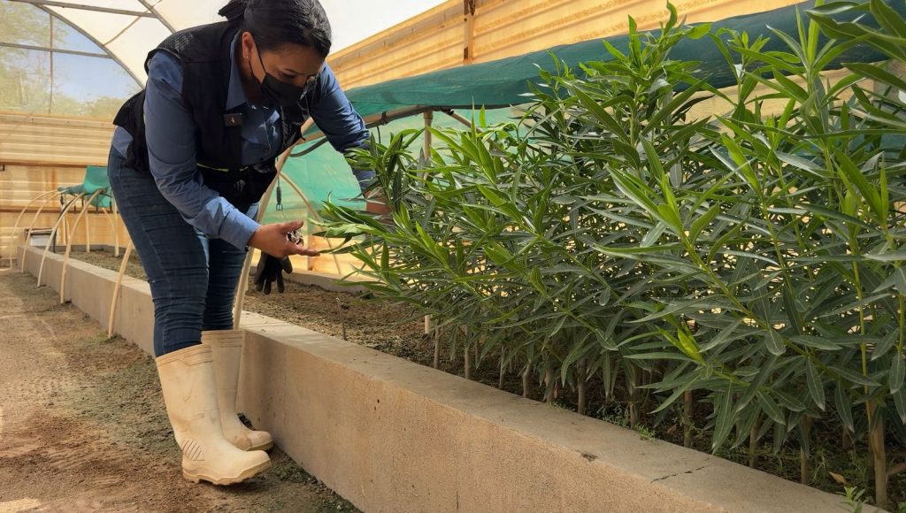 El ingeniero Luis Rodríguez Palma, responsable del vivero, explicó que la producción es integral y permanente, abarcando especies como bugambilias, laureles, algodón y, más recientemente, olivo negro, cuya semilla se trabaja en bolsa directa.