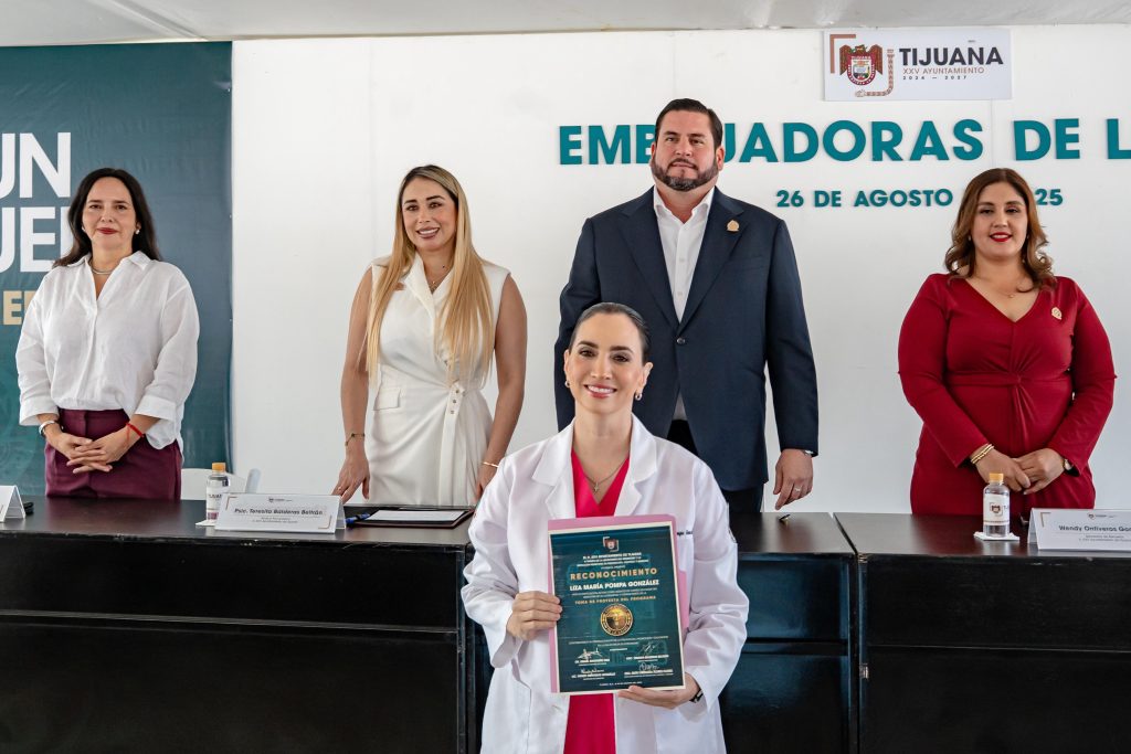 La Síndica Procuradora del XXV Ayuntamiento de Tijuana acompañó al presidente municipal, Ismael Burgueño Ruiz, en el acto de toma de protesta de las Embajadoras de la Salud, una iniciativa que refleja el compromiso de trabajar de manera conjunta entre sociedad y gobierno.