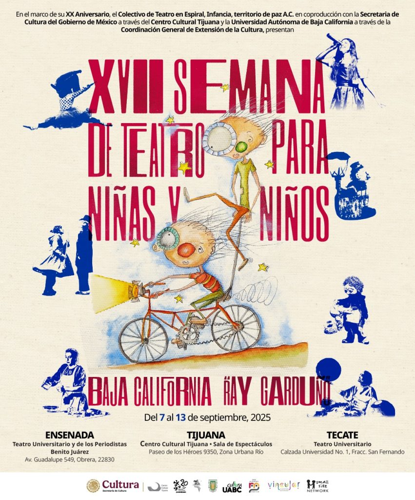 Las actividades de esta semana son presentadas a la comunidad bajacaliforniana gracias al Colectivo de Teatro en Espiral, Infancia, Territorio de Paz A.C. en coproducción con la Secretaría de Cultura del Gobierno de México, a través del Centro Cultural Tijuana y la UABC, a través de la Coordinación General de Extensión de la Cultura y Divulgación de la Ciencia (CGECDC).