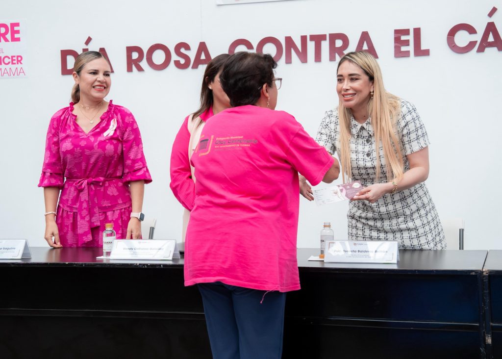 Durante la actividad denominada ‘Día Rosa contra el Cáncer de Mama’, realizada en Palacio Municipal, la Dirección Municipal de Salud Pública, Asistencial y Apoyo a Seguridad Ciudadana, coordinó la entrega de los vales a líderes comunitarias y asociaciones civiles.