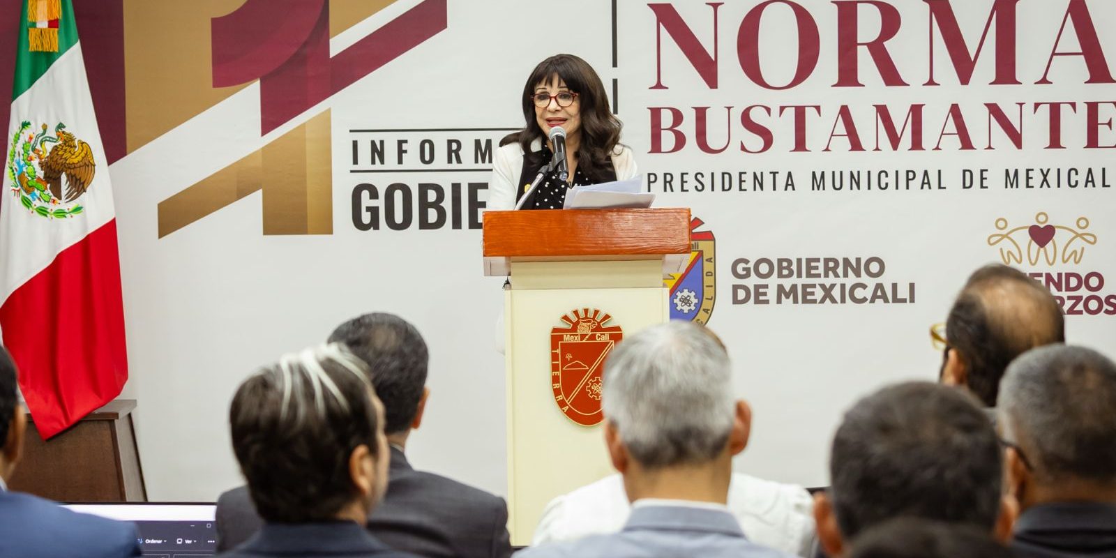 En presencia de la Gobernadora de Baja California, Marina del Pilar Ávila Olmeda, integrantes del H. Cabildo, cámaras empresariales, organizaciones sociales y servidores públicos, la presidenta municipal Norma Bustamante presentó su Primer Informe de Gobierno al frente del 25 Ayuntamiento de Mexicali.