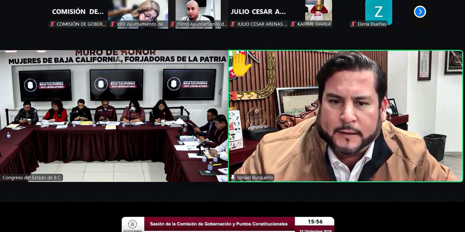 El presidente municipal, Ismael Burgueño Ruiz, participó vía zoom, en la sesión de la Comisión de Gobernación, Legislación y Puntos Constitucionales de la XXV Legislatura de Baja California, donde avaló el proyecto de dictamen para la creación de la Ley para Prevenir, Investigar y Sancionar los Delitos en Materia de Extorsión para el Estado de Baja California.