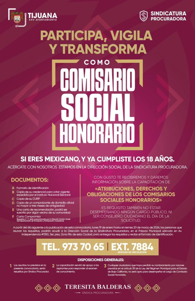 La Sindicatura Procuradora del XXV Ayuntamiento de Tijuana lanzó la convocatoria para que la ciudadanía participe como Comisario Social Honorario, una figura de participación ciudadana que permite vigilar y fortalecer la transparencia en la administración pública municipal.