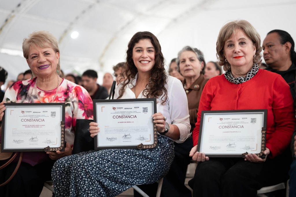 Como parte del evento, se realizó la entrega simbólica de constancias a cinco asociaciones civiles: Martes de Mujeres Alianza de Mujeres por Mujeres; Al Norte sin Límites; Cambiando los Corazones de México TJ; Cuidados Paliativos y Sociedad de Historia de Tijuana, organizaciones que destacan por su labor en distintos ámbitos sociales, culturales y comunitarios.