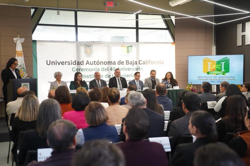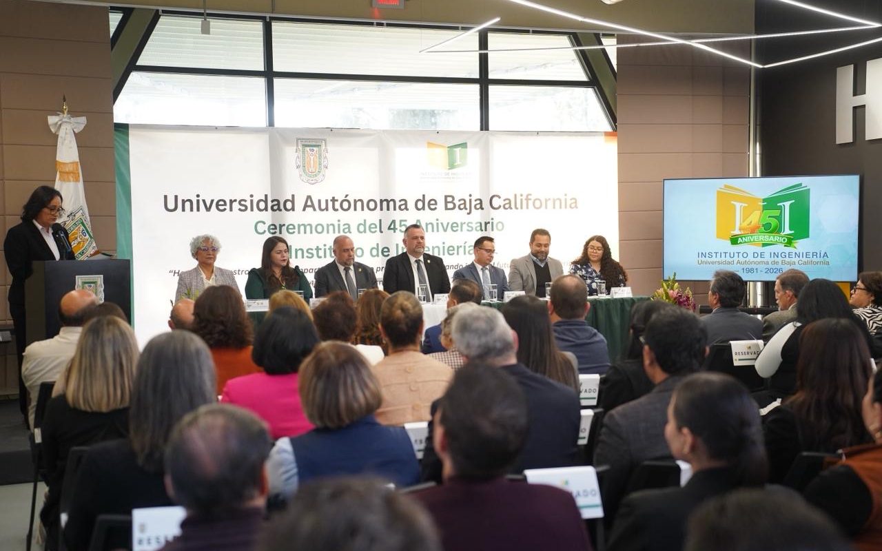 La Universidad Autónoma de Baja California (UABC) llevó a cabo la ceremonia conmemorativa por el 45 aniversario del Instituto de Ingeniería, un acto que reunió a autoridades universitarias, personal académico, investigadores, estudiantes e invitados especiales para reconocer más de cuatro décadas de trabajo académico, investigación científica, innovación tecnológica y compromiso social. A lo largo de su trayectoria, este Instituto se ha consolidado como una entidad estratégica para el desarrollo de Baja California y del país, con una destacada proyección internacional, al tiempo que ha contribuido de manera significativa a la formación de recursos humanos y a la generación de conocimiento.