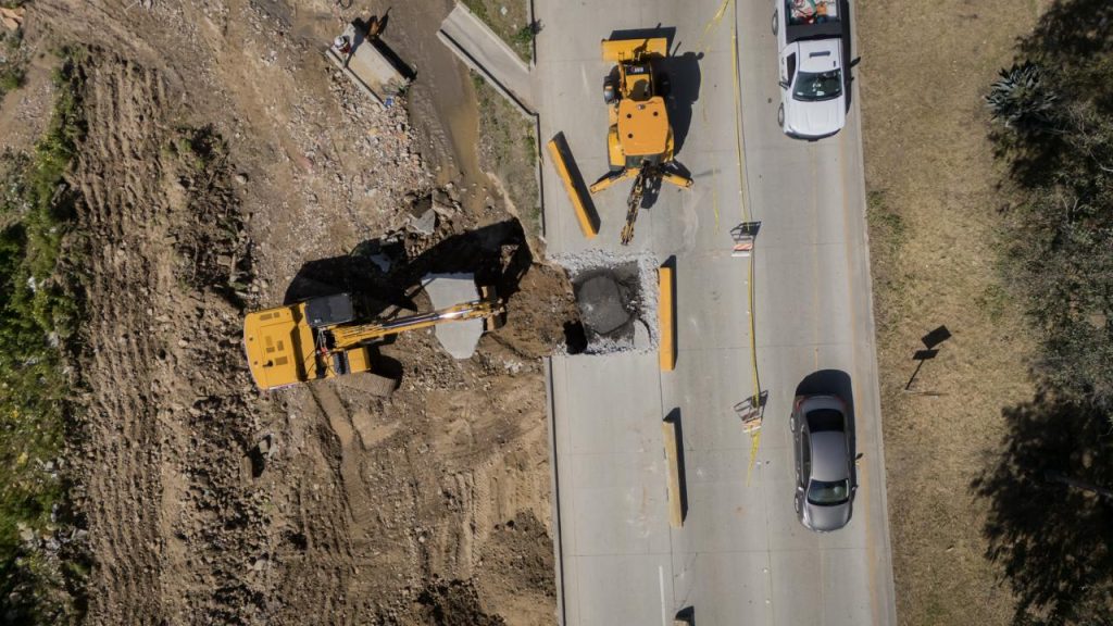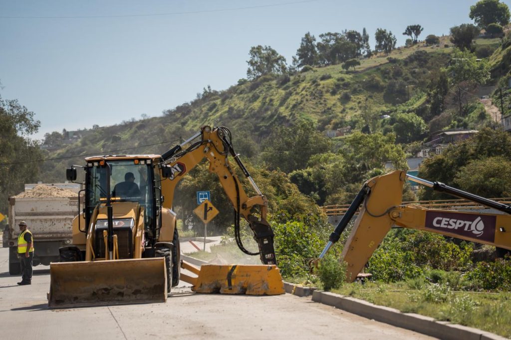 Trabajos de reparación se realizan en el carril de acotamiento del Libramiento Rosas Magallón Sur, a la altura del Puente Amarillo, tras las lluvias recientes que generaron escurrimientos en el arroyo cercano y provocaron el desplazamiento de material de relleno, informó la Comisión Estatal de Servicios Públicos de Tijuana (CESPT).
