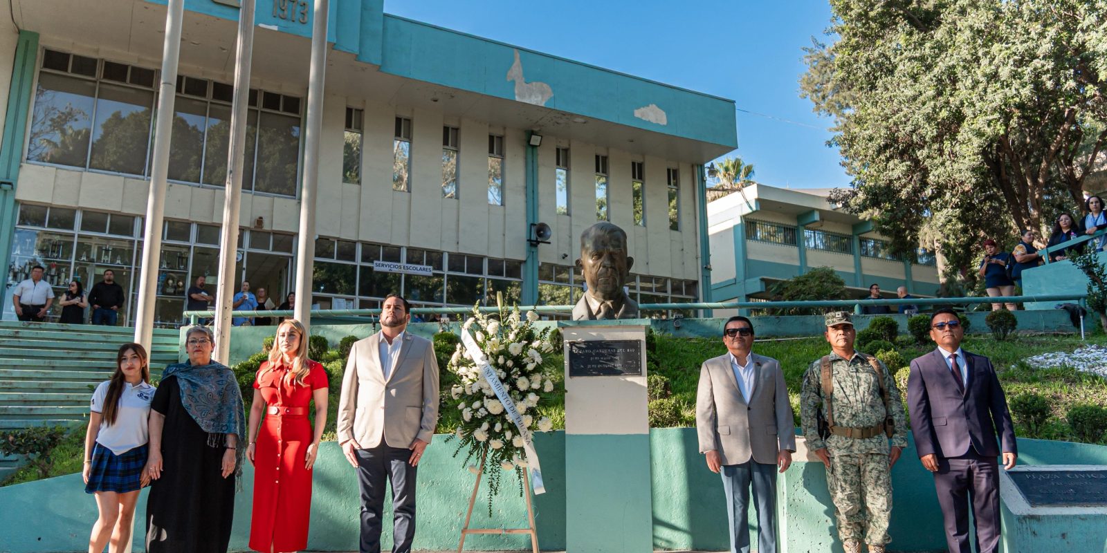 Durante la ceremonia, en la que se montó una guardia de honor, se contó con la presencia de la síndica procuradora, Teresita Balderas Beltrán; el secretario de Gobierno Municipal, Arnulfo Guerrero León; el secretario de Educación Pública Municipal, Miguel Alfredo Nuño García; el Mayor de Infantería de la Secretaría de la Defensa Nacional, Enrique León Luna, así como secretarios, regidores y alumnado de la Preparatoria Lázaro Cárdenas.